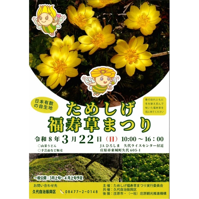 | 内容 | 2026年3月22日(日)「ためしげ福寿草まつり」を開催します。 日本有数の自生地である、庄原市東城町久代地域で、春の訪れとともに冬を耐え忍んで咲いた福寿草をご覧ください。 山菜うどんや、手芸品など販売あります。 主催:ためしげ福寿草まつり実行委員会 共催:久代自治振興区 後援:庄原市・(一社)庄原観光推進機構 ●編集部レポートにて紹介中 「幸せを招く!福寿草鑑賞と春を感じるランチ&スイーツ」 https://www.shobara-info.com/4982 |