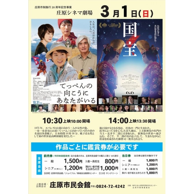 イベントカレンダー | 庄原シネマ劇場 「てっぺんの向こうにあなたがいる」 「国宝」