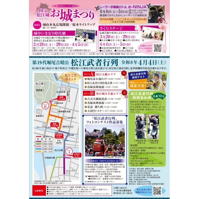 | 内容 | 松江開府の祖、堀尾吉晴公と忠氏公、堀尾衆一行が 400 年の刻をこえて松江城に入城する様子を再現した絢爛豪華な時代絵巻! オーディションで選ばれた主役の堀尾家の7名他、総勢170名のキャストや裏方となる着付けスタッフたちが戦国時代絵巻を再現!毎年、勇壮な武者や色鮮やかな姫などに扮した大勢の市民が参加します! 12:50~ 堀尾家からのお福わけ(松江大橋) 13:10~ 出立式:松江大橋南詰 13:20頃~ 松江大橋南詰出立~武者行列(松江大橋⇒南殿町⇒県民会館西側) 13:30~ 古式火縄銃演武(松江城堀尾鉄炮隊・岩国藩鉄砲隊)/県民会館西側 14:40頃~ 花道、勝どき(県民会館西側) 15:00頃~ 松江武者行列大団円(松江城内馬溜ステージ) . 【松江武者行列・特別参加枠】 県外在住で練習会に参加できない。でも、武者行列に参加してみたい!そんな要望にお応えする形で、当日に、ぱっと参加できる、甲冑・衣装がセットになった『松江武者行列』プランです。 参加費:5,500円(税込み)※予約優先・島根県民会館当日10時集合 ①甲冑武者(黒)5名 / ②足軽(畳鎧)5名 ~~~~~~~~~~~~~~ ◎ 国宝松江城 お城まつり 2026/3/25(水) ~ 4/8(水) |