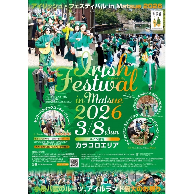 | 内容 | 今年もアイリッシュフェスティバルの季節となりました。 小泉八雲のルーツ・緑の国アイルランド最大のお祭り!! 水上パレードや、緑の遊覧船、音楽・ダンス・フードなどが楽しめるカラコロエリアでのアイリッシュ・イベント、グリーンライトアップなど、楽しいイベントが沢山です。 【水上パレード】 3/8(日)10:00~11:00(荒天時中止) 大手前広場乗船場ーカラコロ広場乗船場 【ミニパレード】 3/8(日)11:00~11:40(荒天時中止) カラコロ広場→京店→カラコロ工房→南殿町→カラコロ広場 パレードでは小泉八雲やセツのコスプレ参加者を大募集! グリーンのものを身につけるのをお忘れなく。 <ミニ・パレード参加者募集> ベスト・コスプレ賞&ベスト・グリーン賞贈呈♪ 受賞者には記念品をプレゼント♪ 定員:先着50名 参加ご希望の方は下記の申請フォームからお申し込みください! https://docs.google.com/forms/d/e/1FAIpQLSf-iMKgXRGlUK67aN8uEnBsYf-CAwjMhhktmTxoRbzjLJDr5Q/viewform?pli=1 【アイリッシュ・ミュージックLIVE&グリーンマルシェ】 3/8(日)11:00~15:00 カラコロ工房 【みんなで踊ろう! アイリッシュ Bon Bon & 京店カラコロマルシェ】 3/8(日)11:00~15:00 カラコロ広場 【連続テレビ小説「ばけばけ」応援イベント】 小泉セツと八雲がモデルの「ばけばけ」は、いよいよ終盤。 八雲の故郷アイルランドのお祭りとともに松江を盛り上げます♪ 【グリーン・ライトアップ】 *カラコロ工房(3/1~3/31) *松江城・TSK・NHK(3/6~3/8) *山陰合同銀行(3/6~3/7) 【緑の遊覧船】 3/6(金)~3/8(日)(雨天中止) 堀川遊覧船がアイリッシュ・カラーに! 誰でもパレード気分が楽しめます。 |