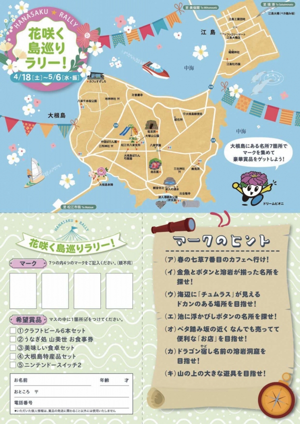 大根島・江島の名所に設置されたマークを応募用紙に記入して応募すると豪華賞品が抽選で当たります! -