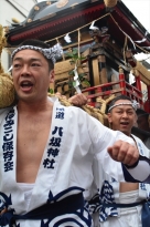 2日目には3体の神輿が幟の周りを駆け回り、その時間を競うタイムトライアルや「三体廻し」が行われ、会場は男たちの熱気で包まれます。