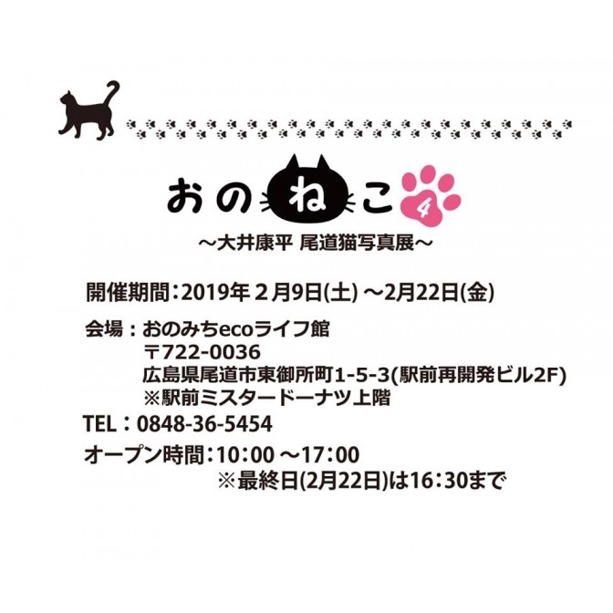 - 「猫写真家」として尾道周辺で活躍中のプロカメラマン・大井康平さんによる猫写真展です。尾道で暮らす猫たちのかわいらしい姿をお楽しみください。