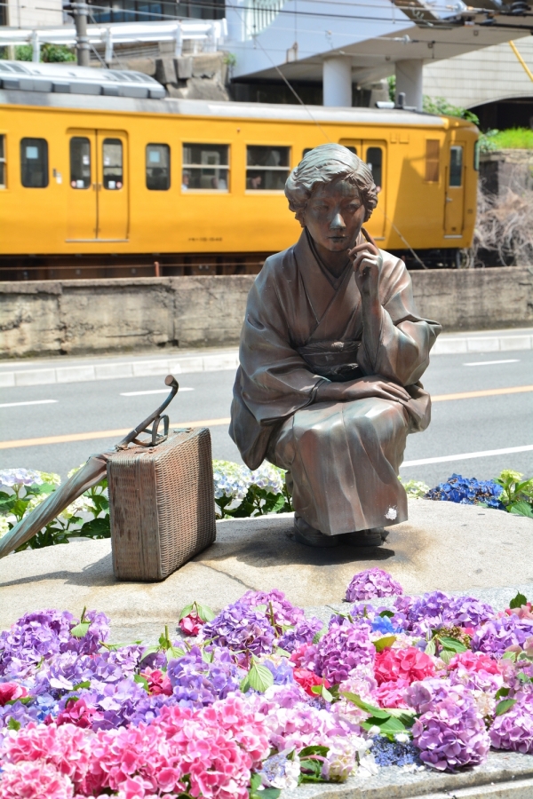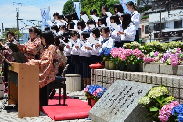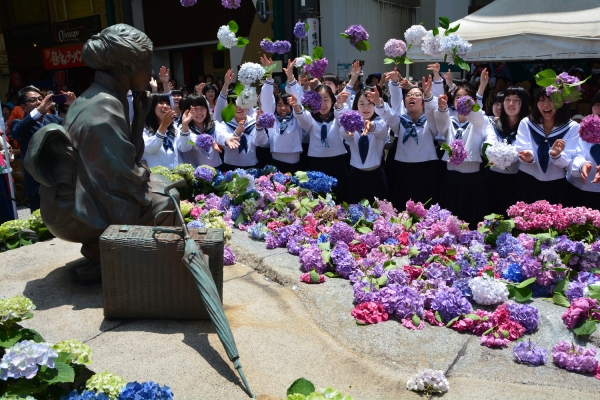 「放浪記」の作者で、幼少時代の多感な時期を尾道で過ごした林芙美子。彼女の命日にちなみ、商店街入り口にたたずむ林芙美子像前にて地元の学生たちによる合唱や演奏、「放浪記」の朗読のほか、あじさいの献花などが行われます。