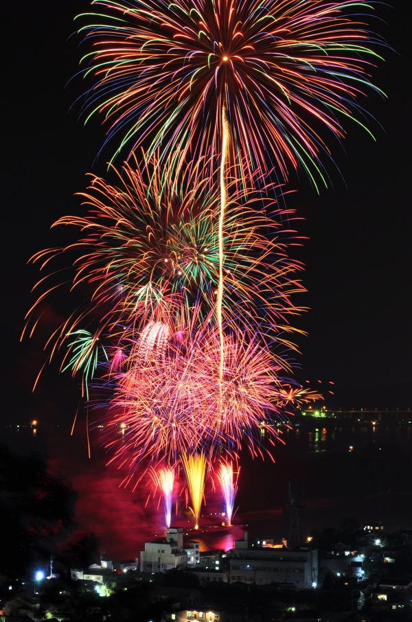 土生港の沖合に浮かぶ鶴島付近より約3,000発の花火が、息をつく暇もなく次から次へと打ちあがります。 -