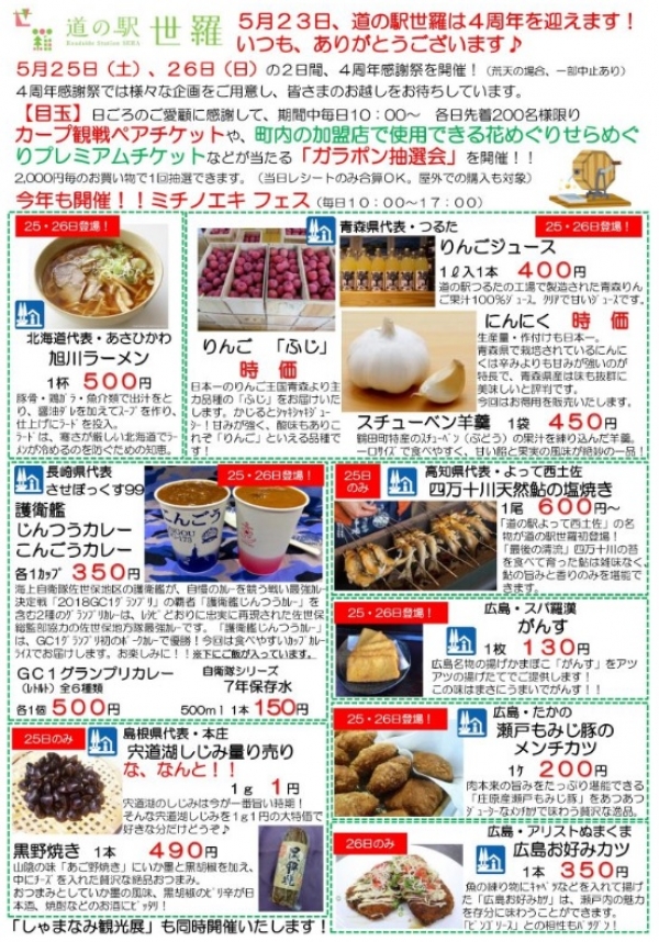 道の駅世羅の開業4周年を記念し、各地の道の駅の特産品の販売や、ご当地バーガー「せらバーガー」のフェスタ、しまなみ海道・やまなみ街道沿線のPRコーナー「しゃまなみ物産展」、「大人が楽しむ金魚まつり」など盛りだくさんの2日間です。