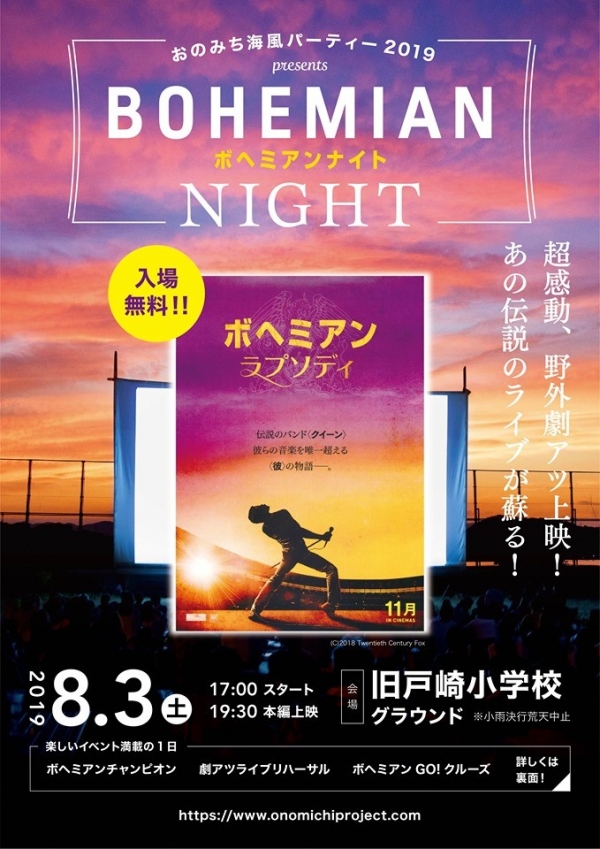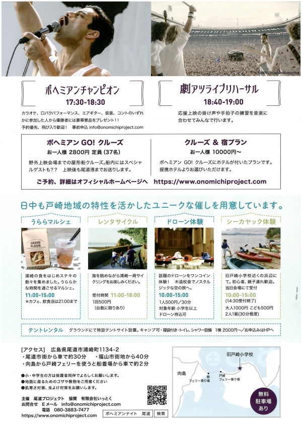 尾道市浦崎町で、世界的な超大ヒット映画「ボヘミアン・ラプソディ」の野外上映をはじめ、尾道市役所横港~旧戸崎小学校間を結ぶ屋形船「ボヘミアンGO!クルーズ」や、クイーンのパフォーマンスコンテスト「ボヘミアンチャンピオン」などの特別企画も開催されます。