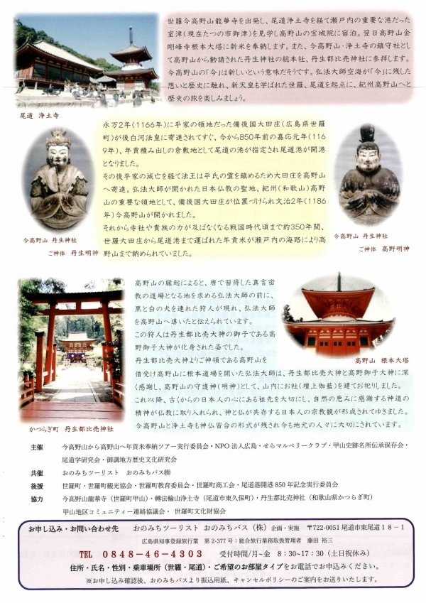 550年時を経て、総本山の高野山、総本社の丹生郡比売神社、世羅町の今高野山、尾道市の浄土寺、丹生神社が「年貢米」の奉納をすることで交流を復活します。 -