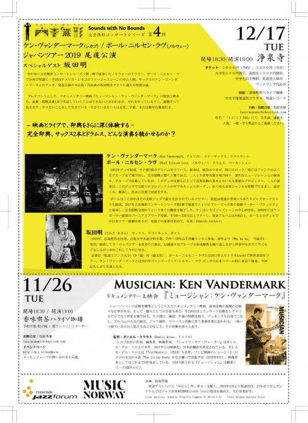 プレイベントとして、ドキュメンタリー映画『ミュージシャン:ケン・ヴァンダーマーク」』の特別上映あり。ステージの上からは見えてこない職業としての即興ミュージシャンを追った映画。前衛・即興音楽1本で生活していくことはできないと言われる。そんな音楽をやりながら、ケンは、これまで40ほどのプロジェクトで100枚以上のアルバムをリリースし、年間240日以上ツアーを行い、音楽活動をする。やりたいことをして生きている。その裏側すべて見せます!生きていきたい人は必見の映画。字幕、または簡単な解説付き。 https://www.ononavi.jp/sightseeing/calendar/detail.html?detail_id=2145&ym=201912