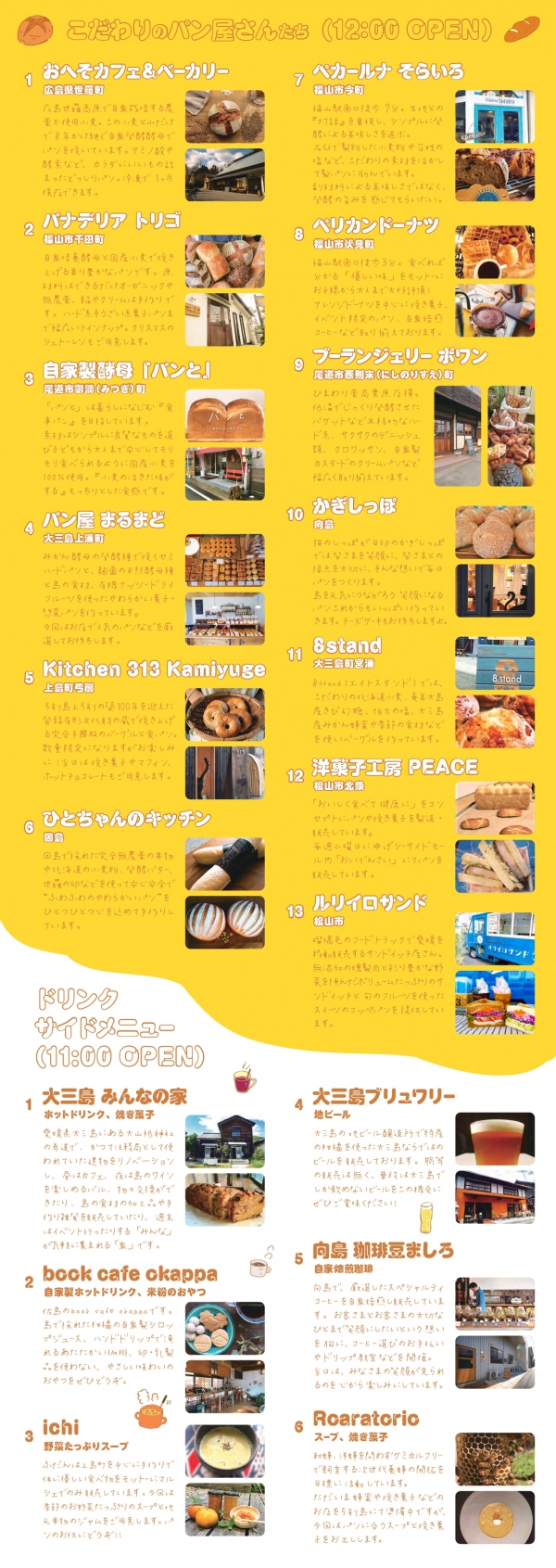 地元上島町をはじめ、北は世羅町、南は松山市までの名店13店舗がこだわりパンが大集合。パンのほかにもコーヒーやスープなどのお店も出店します。
