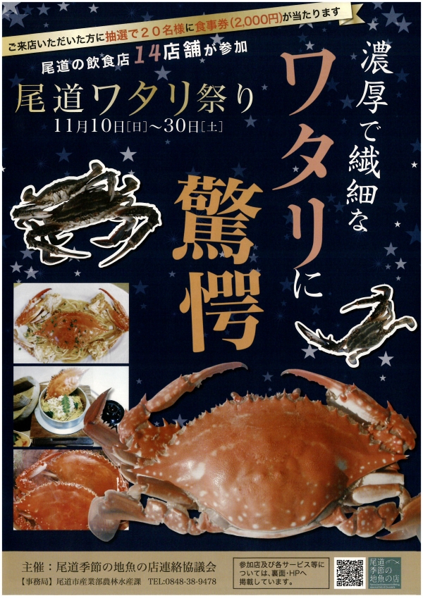 尾道ワタリ祭りの期間中に参加店でワタリガニ・メニューを注文されたお客様で、簡単なアンケートにお答えいただいた方に、抽選で20名様に祭り参加店で利用できる食事券(2,000円)が当たります。