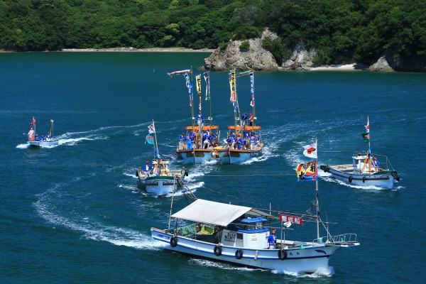 この鯛網は380年もの歴史を持ち、産卵のために鞆の浦へやってきた鯛を地引網で捕まえます。船上で大漁を願いながら舞い踊る乙姫も見どころのひとつです。 -