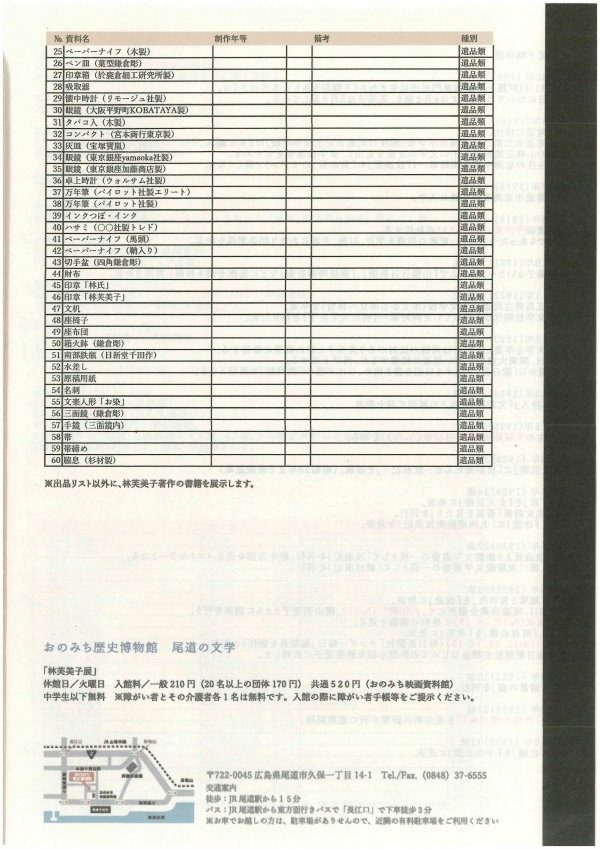 尾道にゆかりの深い作家、林芙美子の原稿や書簡、絵画、遺品類が展示されます。