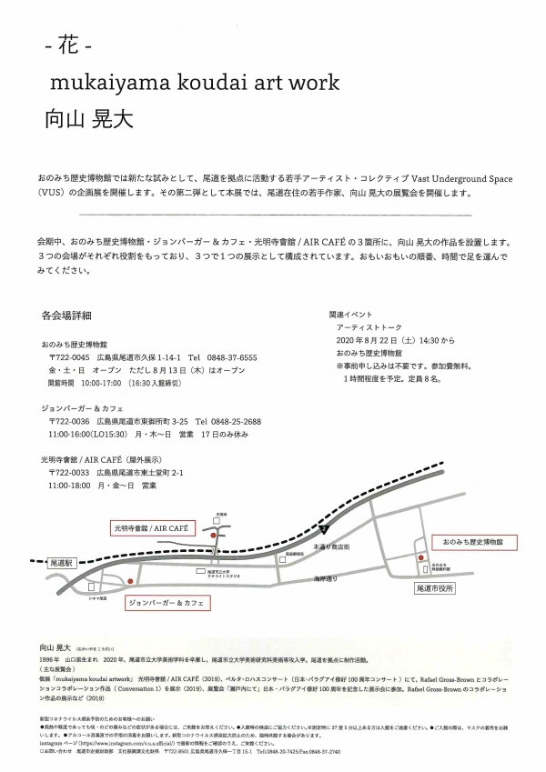 会期中は、おのみち歴史博物館・ジョンバーガー&カフェ、光明寺會舘/AIR CAFEの3か所に作品が設置されます。3つの開場がそれぞれの役割をもっており、3つで1つの展示として構成されています。