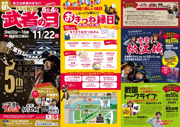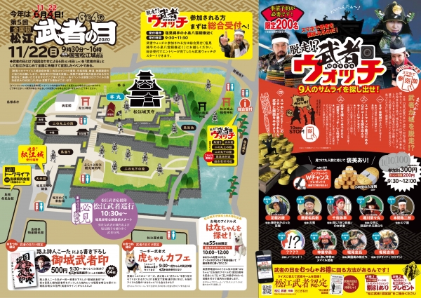 国宝の松江城を舞台に城攻めのアドベンチャー体験をしたり、れきしくんとお城博士ちゃんによるトークライブ、逃げ出した武者を探し出すイベントなど楽しみながら松江城の魅力を感じることができるイベントです。