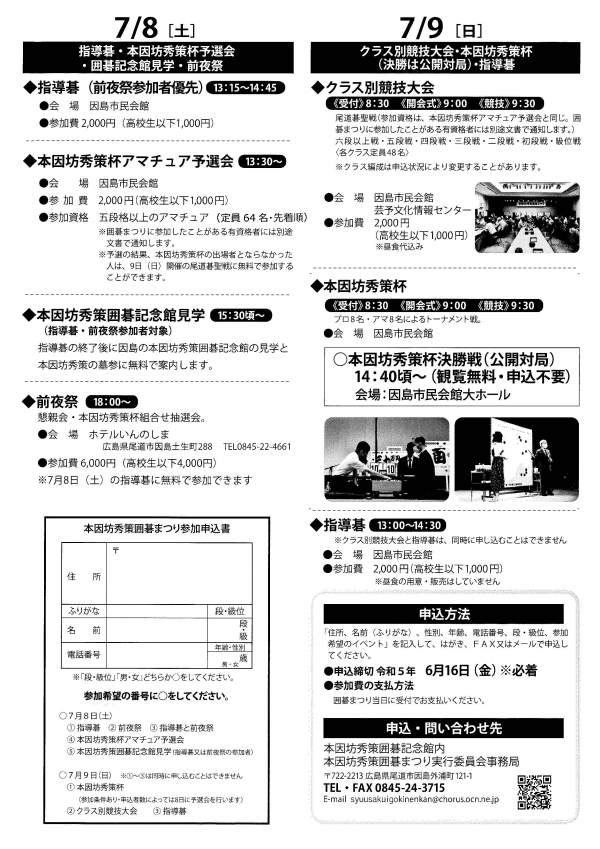 6月16日(金曜日)までに、「住所、名前(ふりがな)、年齢、電話番号、段・級位、参加希望のイベントを記入のうえ、郵送、Faxまたはメールで申込 -