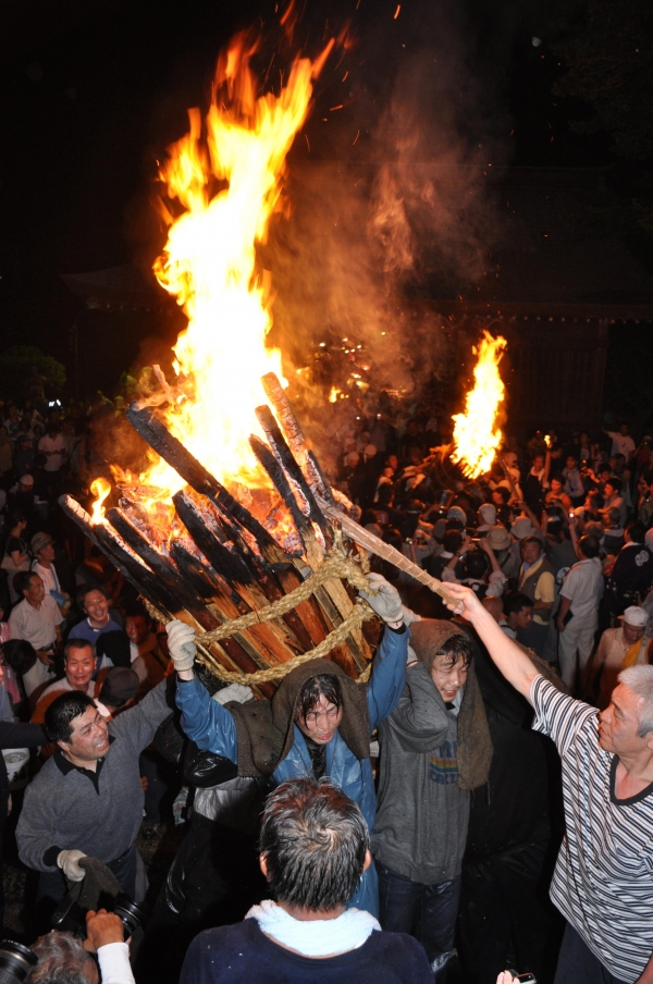 火の付いた約150kgの大松明三体を拝殿までの大石段を担ぎ上げ、祭りはクライマックスを迎えます。 -