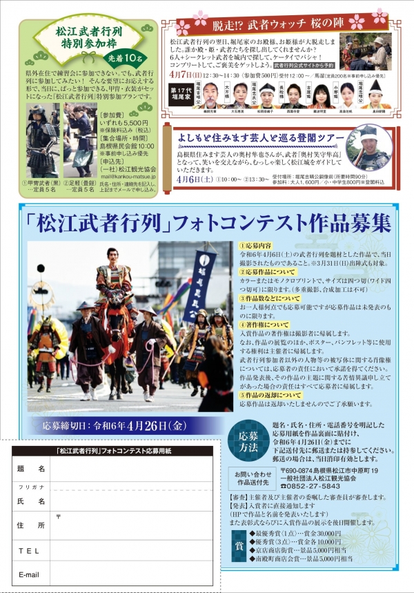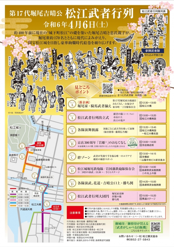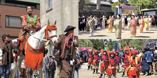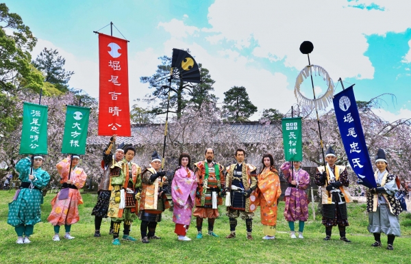 オーディションで選ばれた主役の堀尾家の7名他、総勢170名のキャストや裏方となる着付けスタッフたちが戦国時代絵巻を再現!毎年、勇壮な武者や色鮮やかな姫などに扮した大勢の市民が参加します。