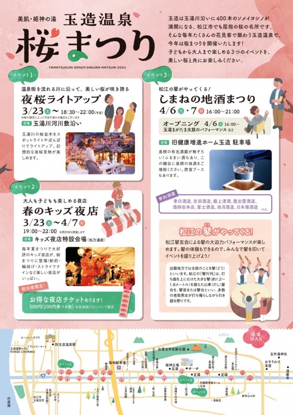 玉造は玉湯川沿いに400本のソメイヨシノが満開になる、松江市でも屈指の桜の名所です。毎年たくさんの花見客でにぎわう玉造温泉で、今年は桜まつりが開催されます!