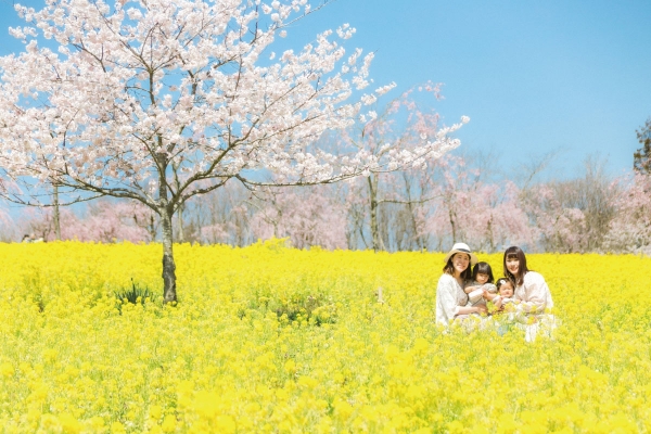約3万平方メートルの丘に咲き誇るシダレザクラと菜の花、そして高原の青空が奏でる春の色をお楽しみください。