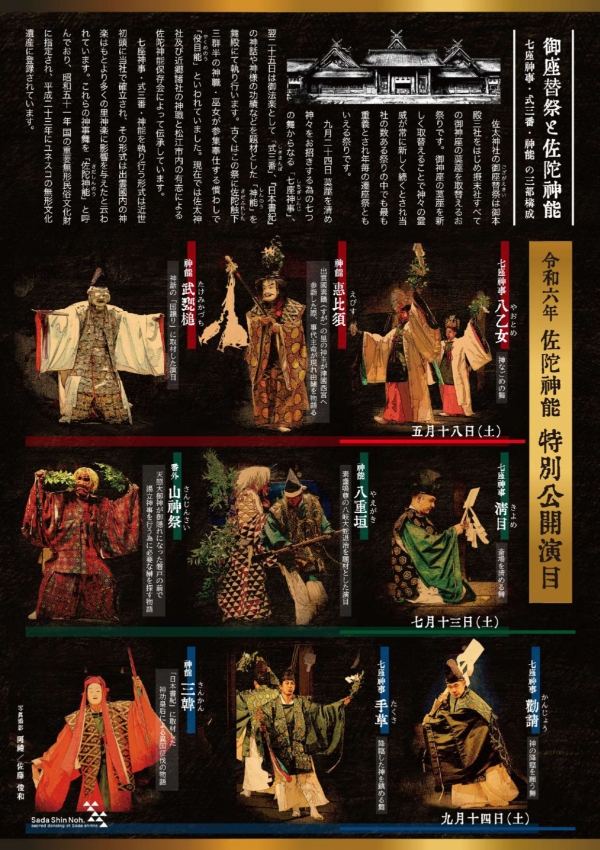 「佐陀神能」とは佐太神社の祭礼の中でも重儀とされる「御座替祭」(ござがえまつり) に合わせて執り行われる三つの神事舞の総称です。
