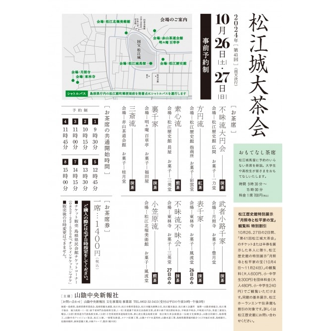 松江城周辺の7施設で開催。41回目を迎える今回は、9流派が参加。各会場とも昨年に続いて予約制です。