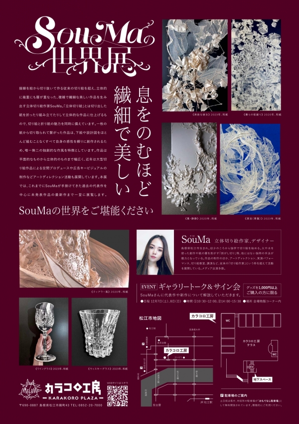 描線を絵から切り抜いて作る従来の切り絵を超え、立体的に幾重にも層が重なった、複雑で繊細な美しい作品を生み出す立体切り絵作家SouMaさん(松江市出身)。「立体切り絵」とは切り出した紙を折ったり組み立てたりして立体的な作品に仕上げるもので、切り絵と折り紙の魅力を同時に備えています。一枚の紙から切り取られて繋がった作品は、下絵や設計図をほとんど組むことなくすべて自身の感性を頼りに創作されるため、唯一無二の独創的な作風を特徴としています。作品は平面的なものから立体的なものまで幅広く、近年は大型切り絵作品による空間プロデュースや広告キービジュアルの制作などアートディレクション活動も展開しています。