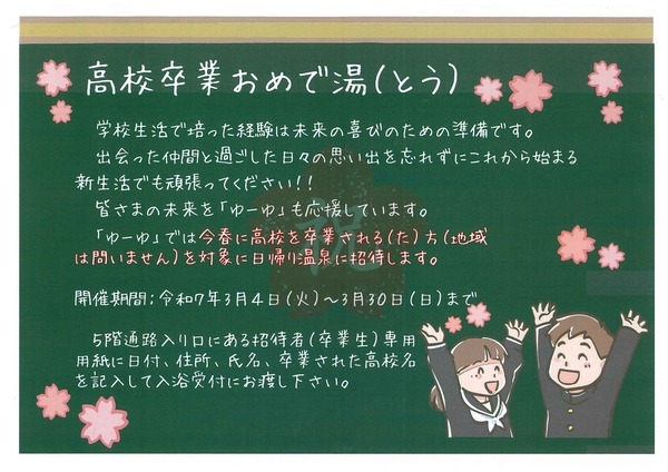 今春に高校を卒業される(た)方を対象に「玉造温泉ゆ~ゆ」温泉入浴料を期間限定で無料ご招待!(※地域は問いません)