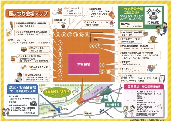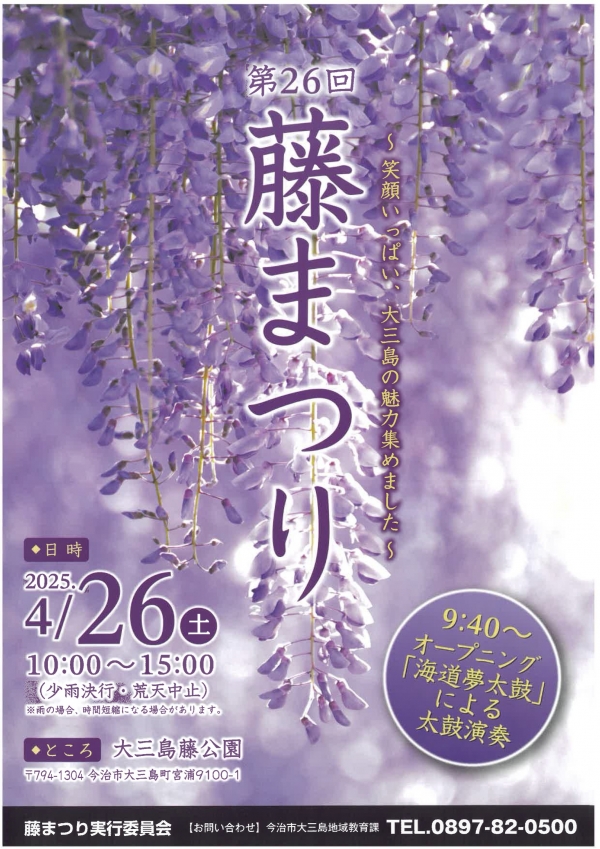 藤の花を見ながら大三島のおいしいもの、すてきな文化、出し物などを楽しむ、大三島の魅力がたくさん詰まったお祭りです。