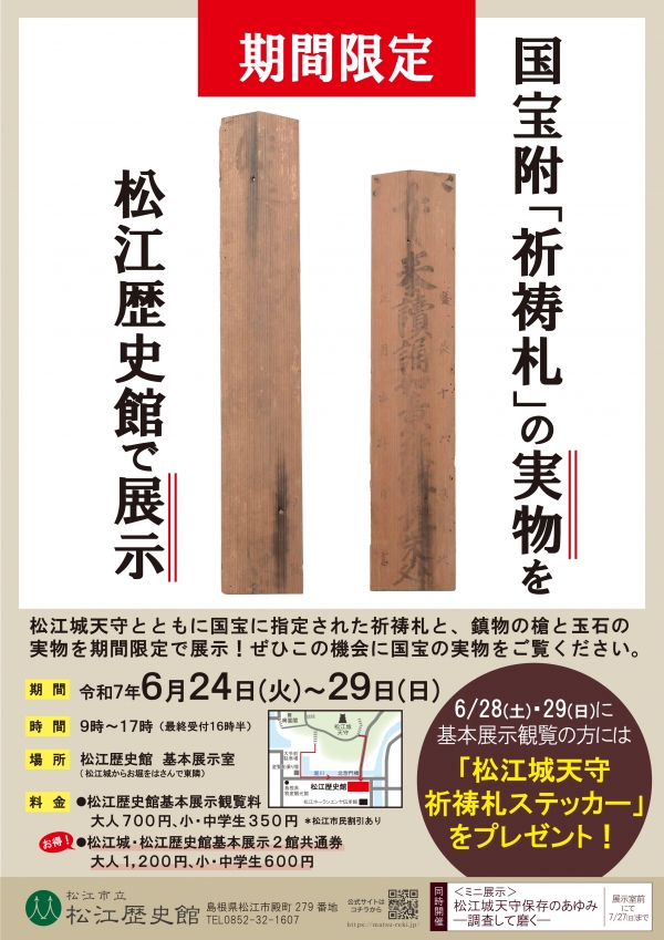 松江城天守の創建年代を示し、天守とともに国宝に指定された祈祷札と、築城に際して工事祈願をおこなった鎮物(祈祷札、玉石、槍)の“実物”を期間限定で展示します。実物を見ることができる限られた機会ですので、ぜひご覧ください。