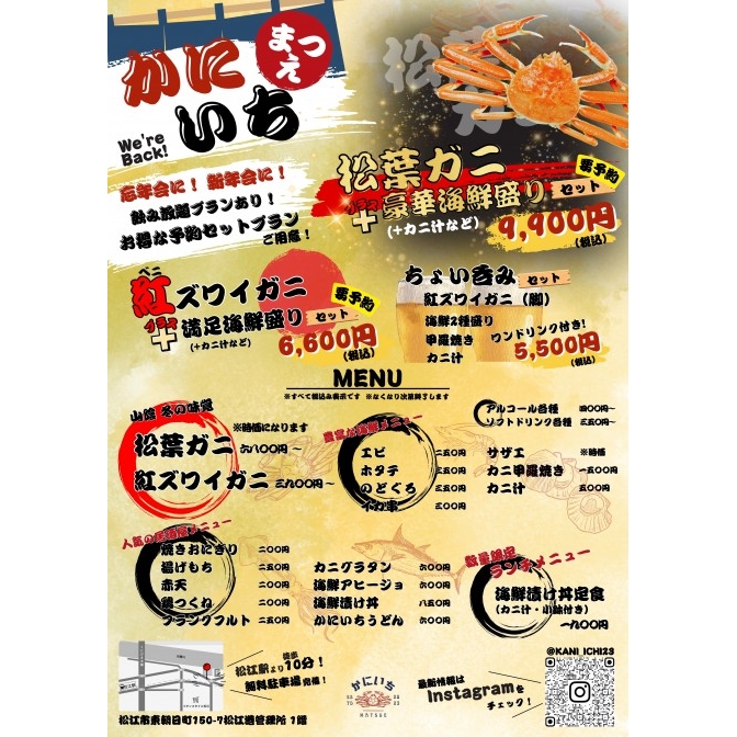 山陰の冬の味覚「松葉ガニ」と「紅ズワイガニ」を、網焼き・豪華海鮮盛りで楽しめる期間限定イベント