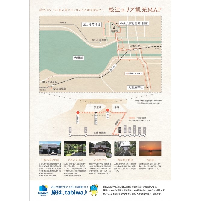 - 小泉八雲とセツが出会った城下町・松江をバスでめぐる体験ツアー。車がなくても土地勘がない人も、気軽に巡礼できる楽々半日プラン(約3時間半)です。