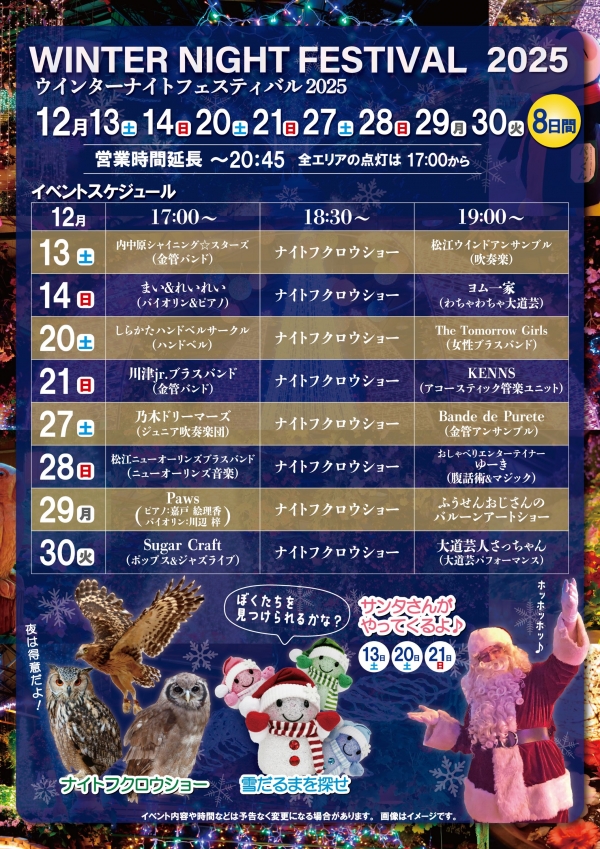 イルミネーションだけではなく、夜の鳥たちの様子も必見です。他にもステージイベントやナイトフクロウショーなどイベントも盛りだくさんで開催します。