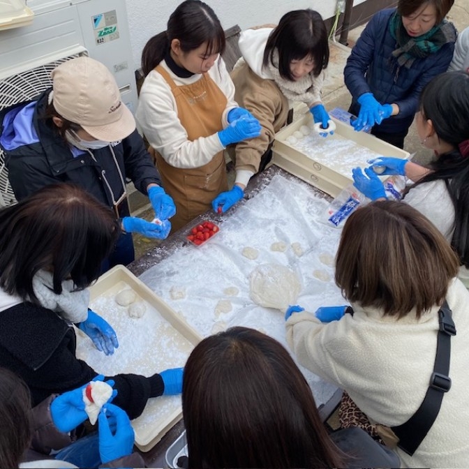 - 希望者全員参加の餅つきです。つきたてのお餅だけでなく豚汁もおもてなし致します!