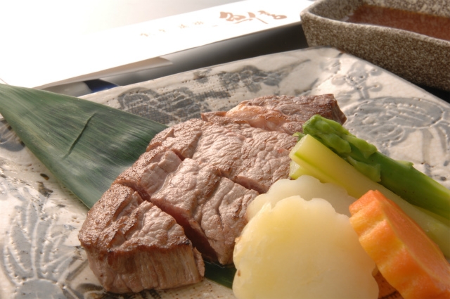 ・お魚主体のお料理ですが、牛のステーキもあります。事前にご注文ください。