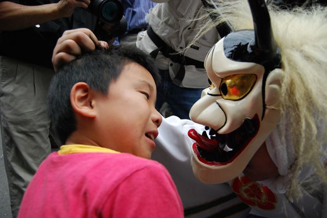 ベタ・ソバ・ショーキーの三つの鬼の面を付けた氏子が子供たちを追いまわし、ささらや祝棒などの棒で頭を叩いたり、突いたりされると病気平癒のほか、子宝に恵まれたり頭が良くなるとされています。