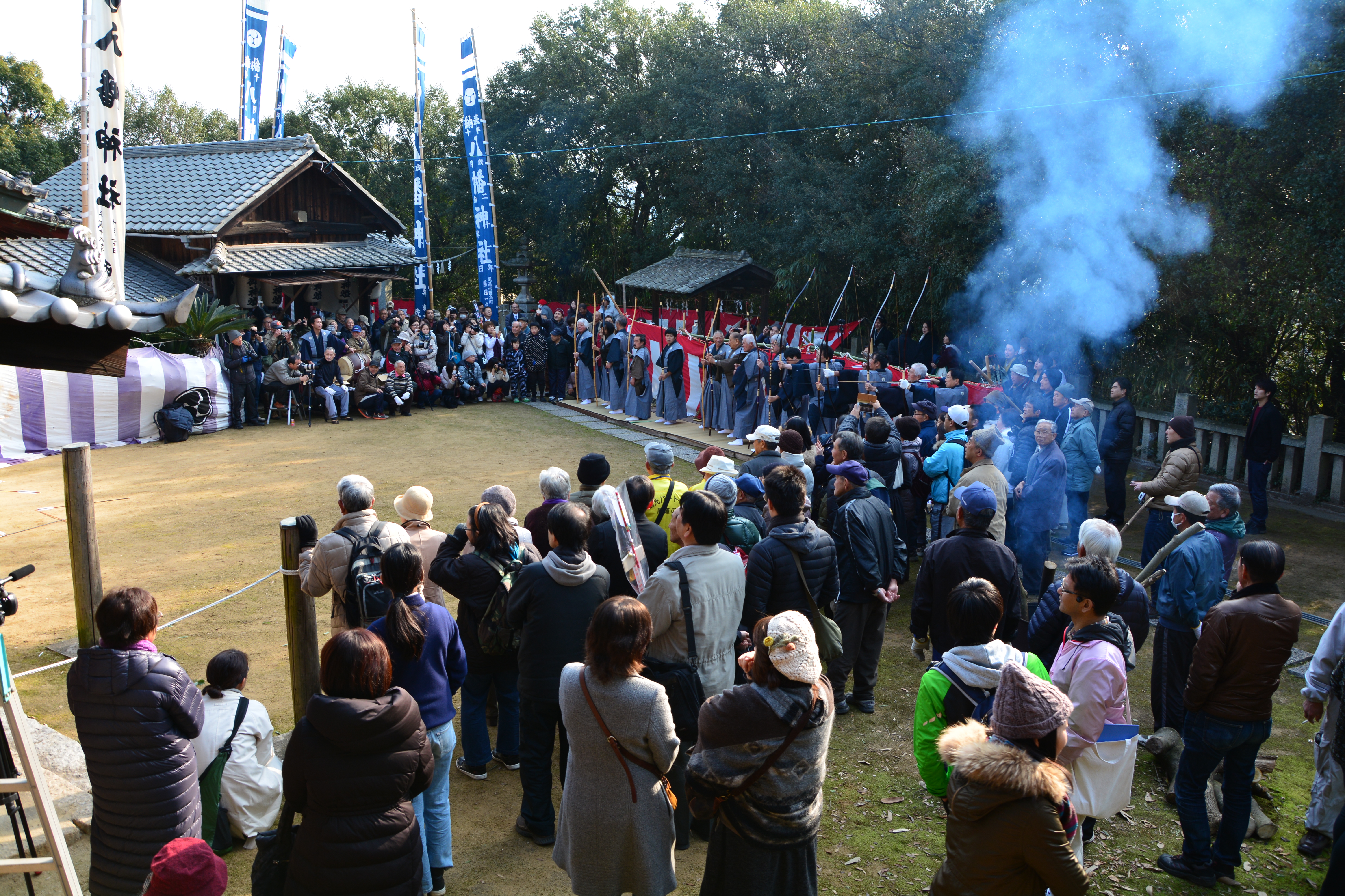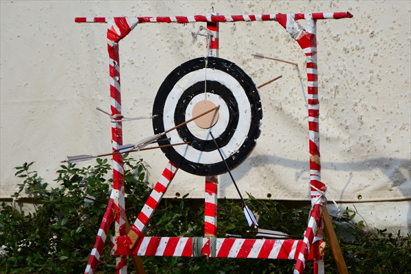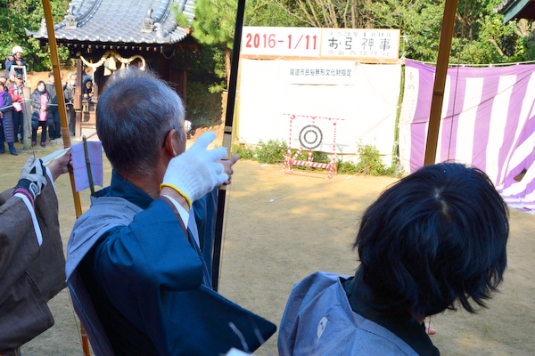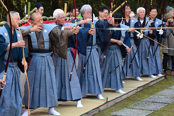 島内3地域から選ばれた男衆15人が約15m離れた直径60㎝の的へ太鼓の合図とともに次々に矢を放ちます。