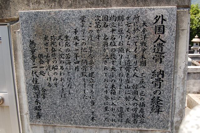 太平洋戦争末期、三庄八区の捕虜収容所で無くなったのイギリス・韓国の労働者約30柱の遺骨を祀っています。