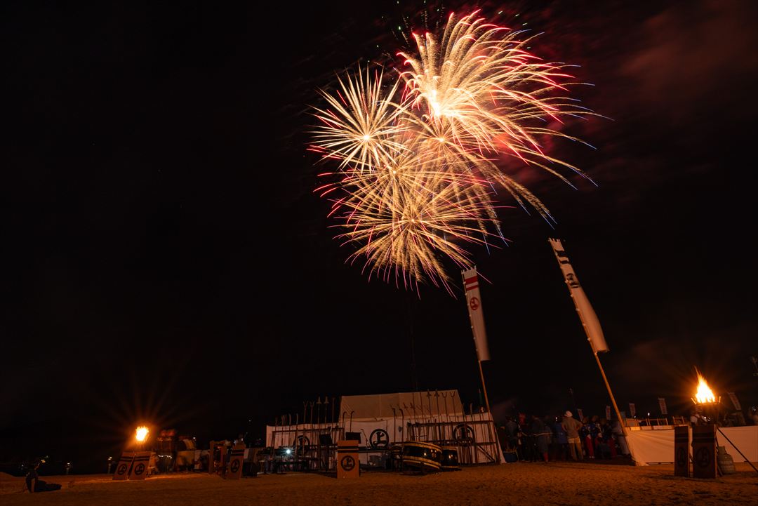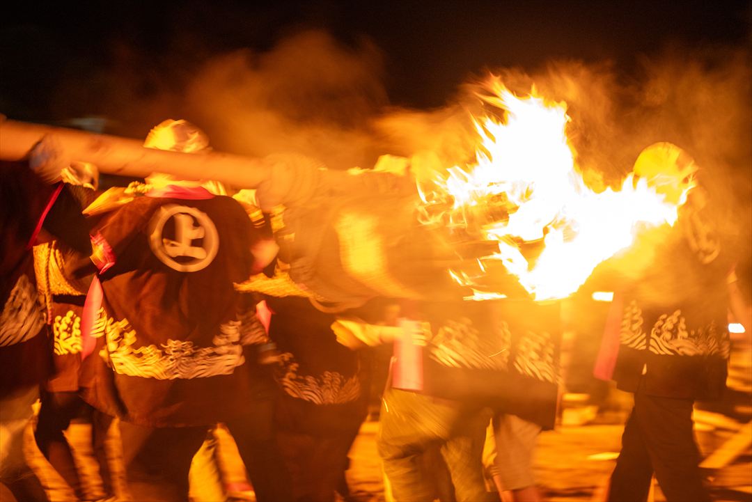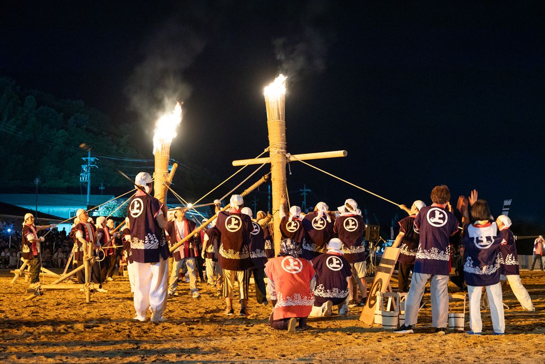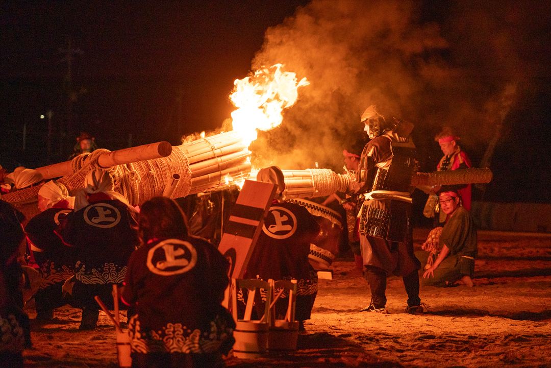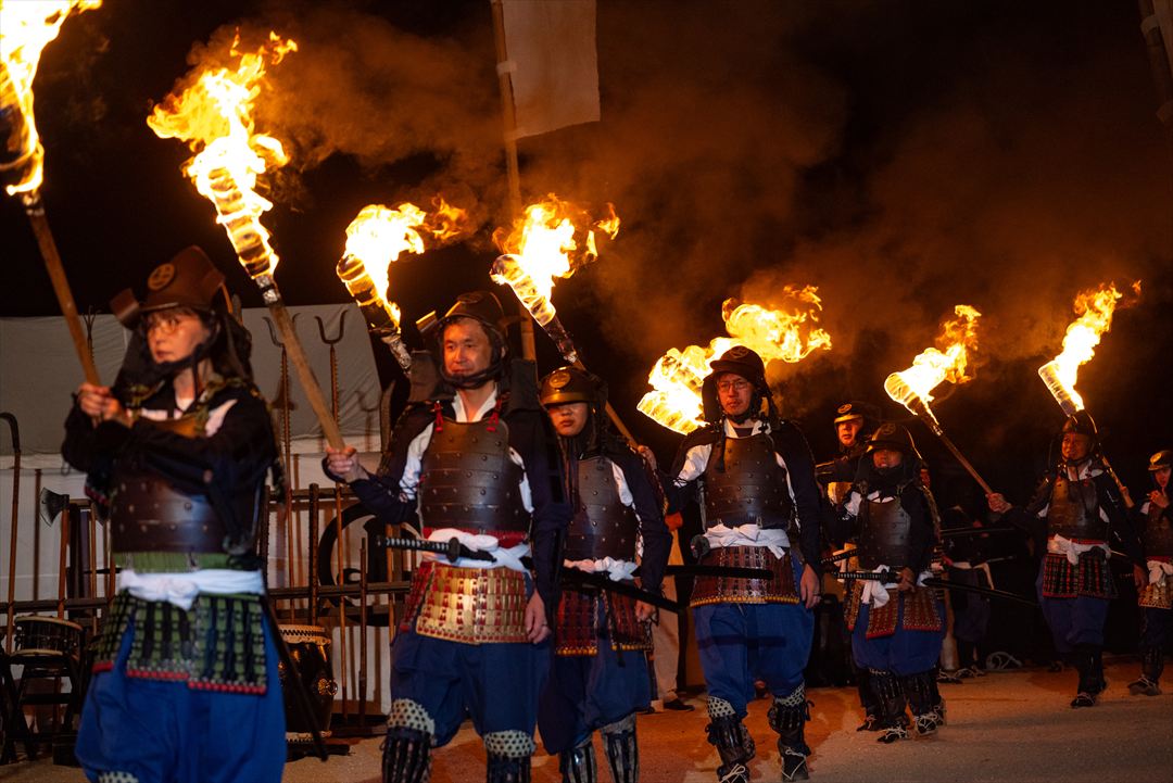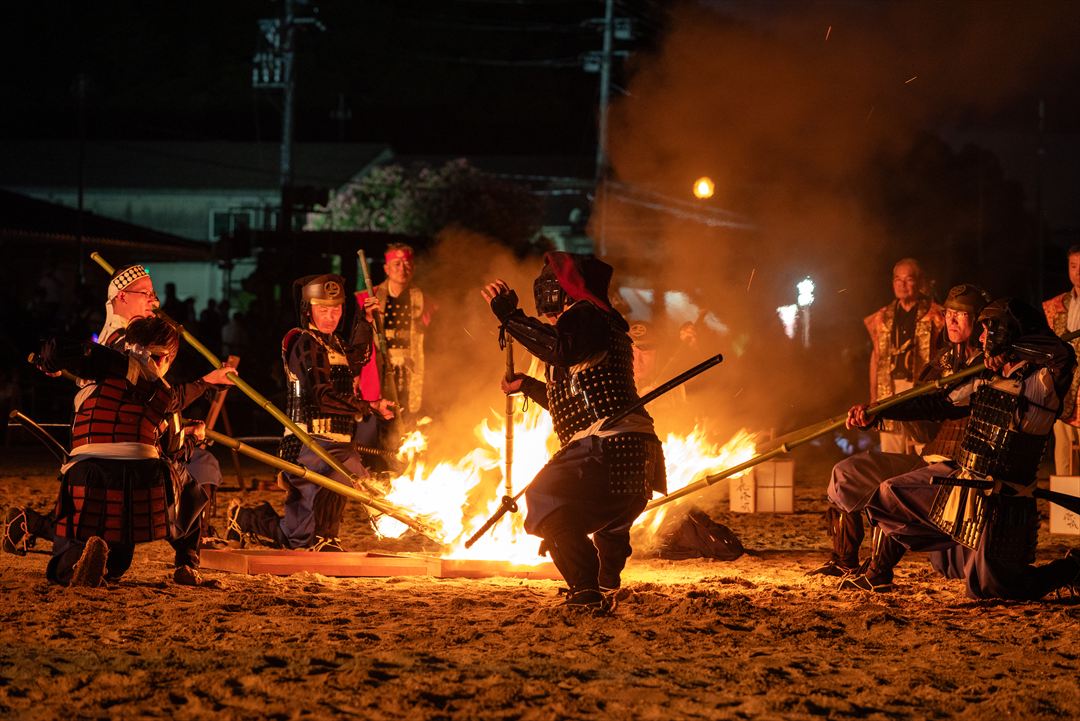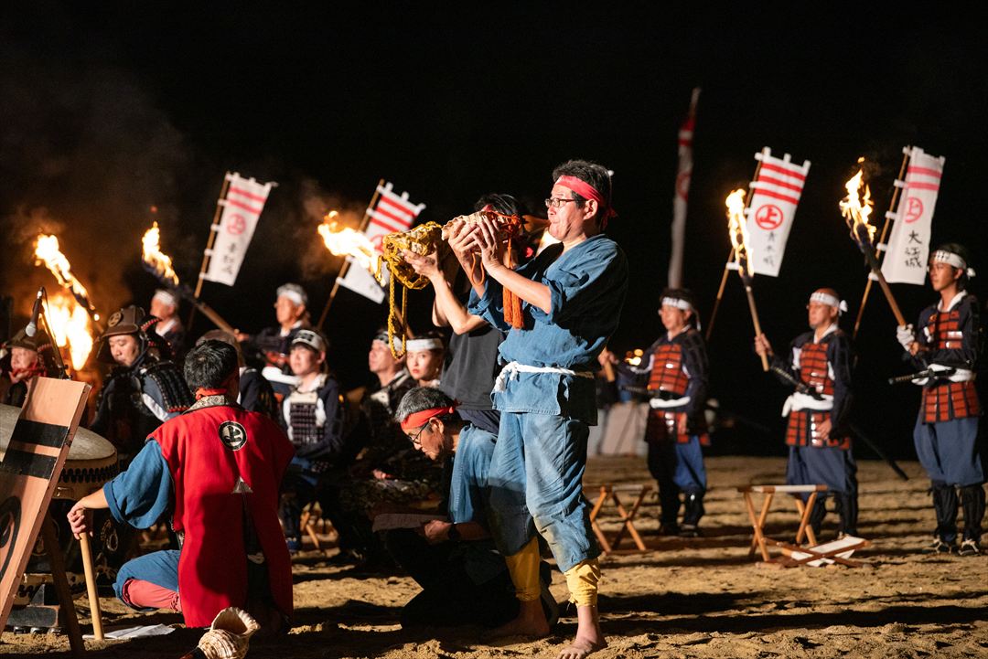2部構成で行われる祭りのうち「島火まつり」では水軍の活躍や無事に帰還したことを喜ぶ「水軍跳楽舞」の披露や、帳の下りた海岸を舞台に松明を持った水軍武者たちが大集合する武者行列、クライマックスには花火も打ち上げられます。