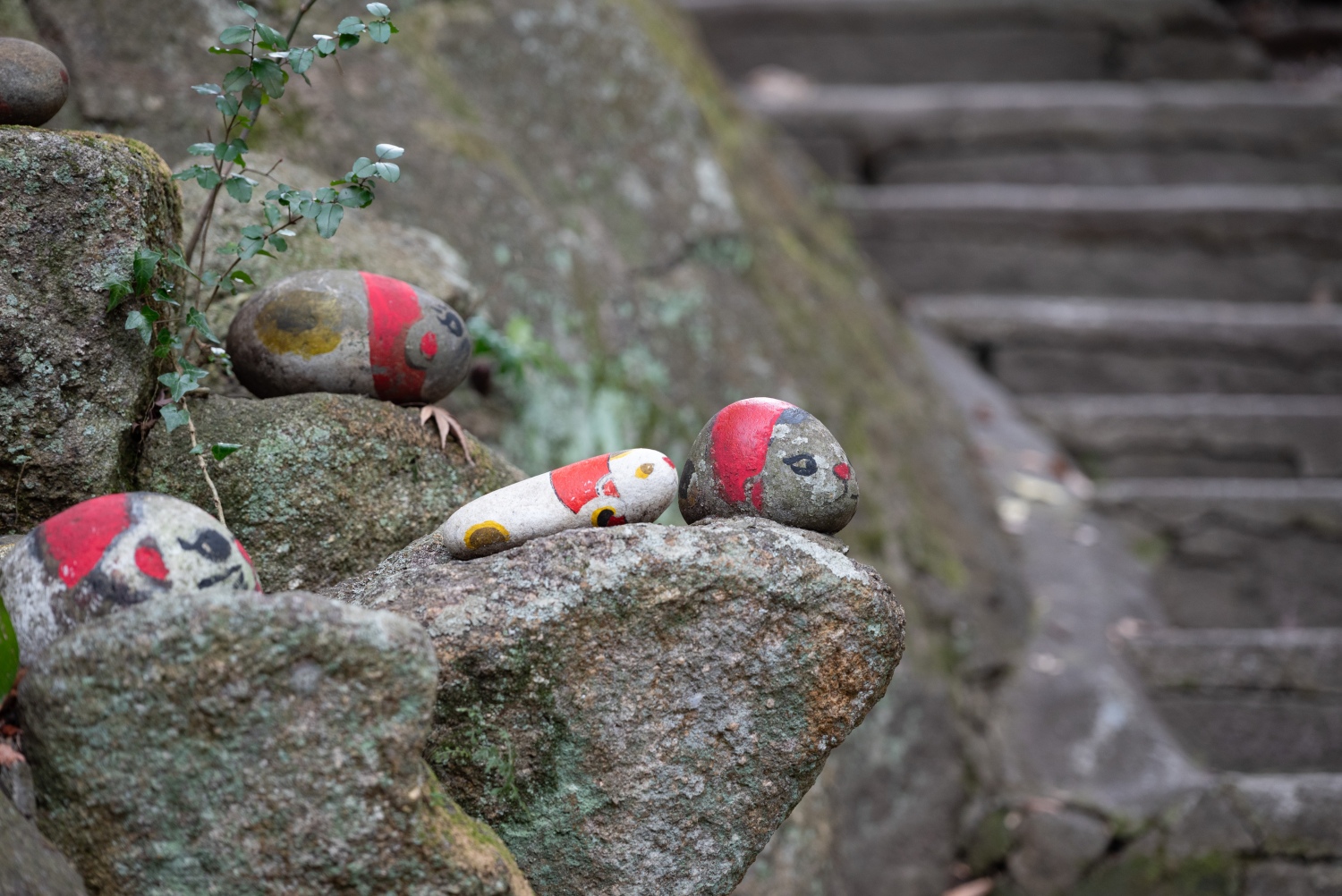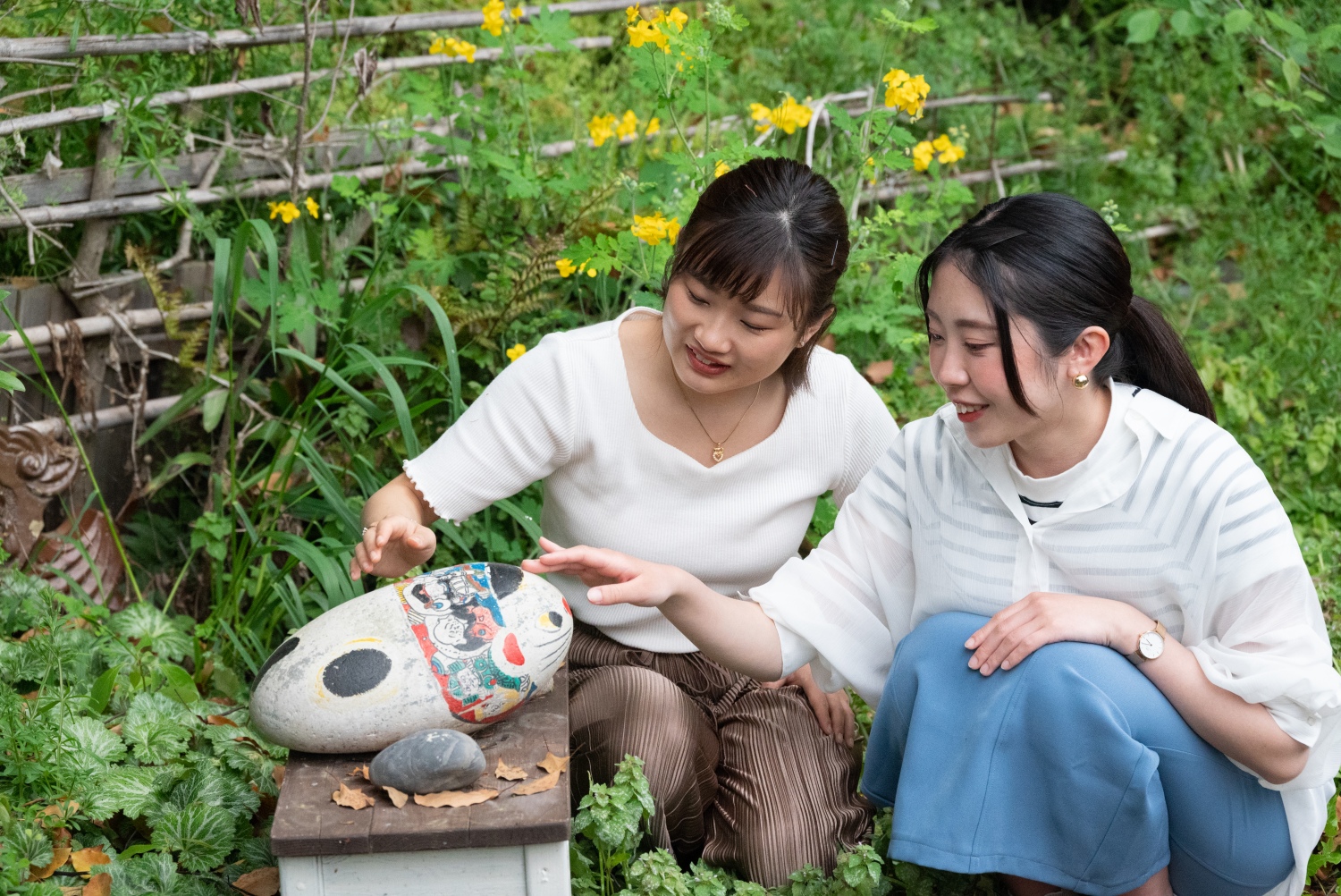 路地に一歩踏み込むと茂みに隠れた福石猫や猫のオブジェなどが出迎えてくれ、まるで時間の流れが遅くなったような不思議な錯覚を覚えます。